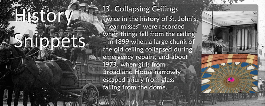 In 1899, plans were well in hand for the building of “the great extension” of St. John’s – the present dome area, transepts, chapel, chancel and sanctuary. The nave rebuild was stage 2, and was eventually completed in 1938. But in August that year, the ceiling of the nave was found to be dangerously close to collapse, and repair work to secure it resulted in a massive section of plaster crashing to the pews below. In Church News, the writer observed, “Had this fallen during a service it would have extinguished the chief intelligence, and also, as a young lady who usually sits near the spot; remarked, the best-looking part of the congregation.”