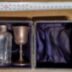 Silver-plated miniature chalice and glass bottle with silver cap.